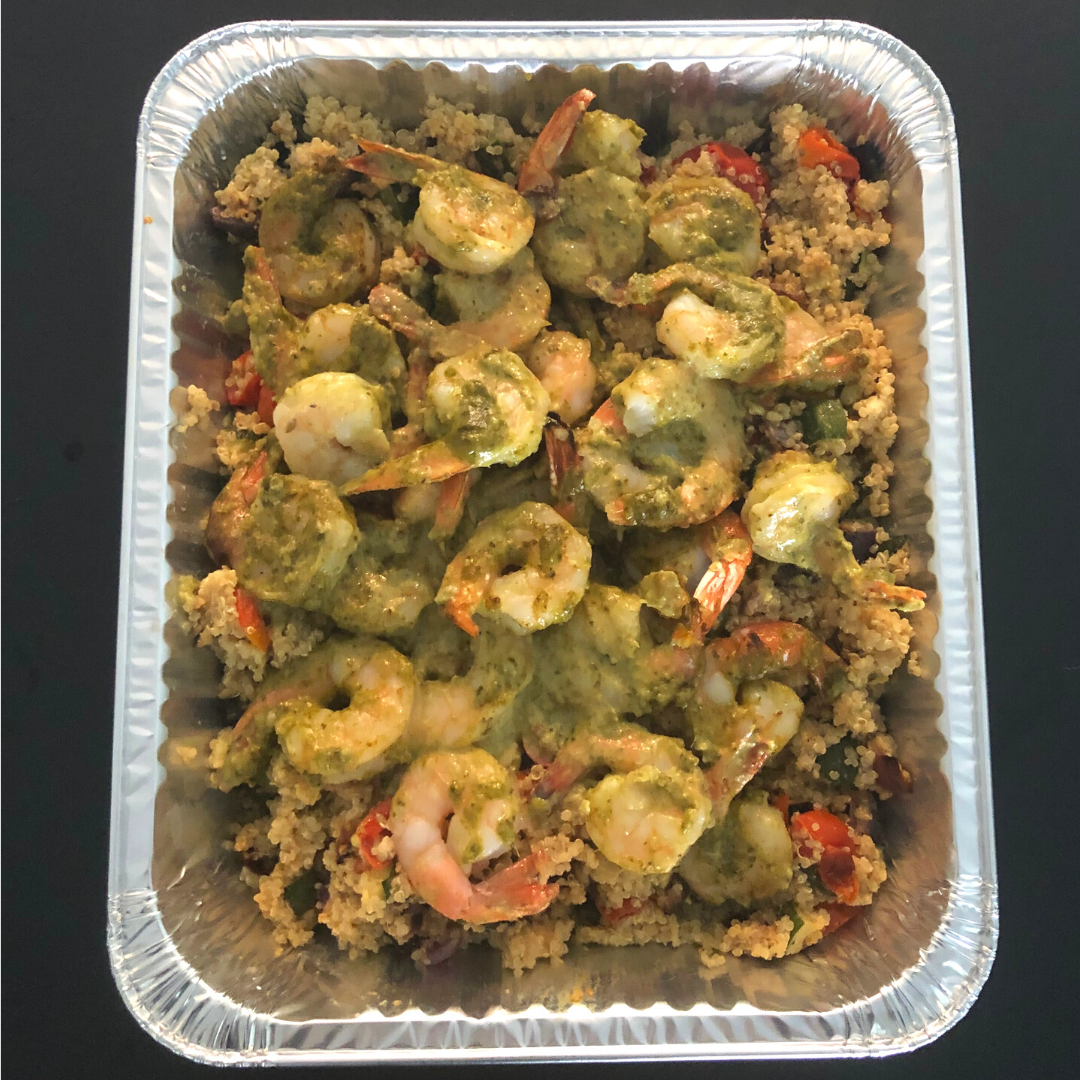 Pesto Shrimp: Local shrimp sautΓ©ed and tossed in pesto, served with roasted vegetables; tomatoes, zucchini, and red onions, and citrus quinoa